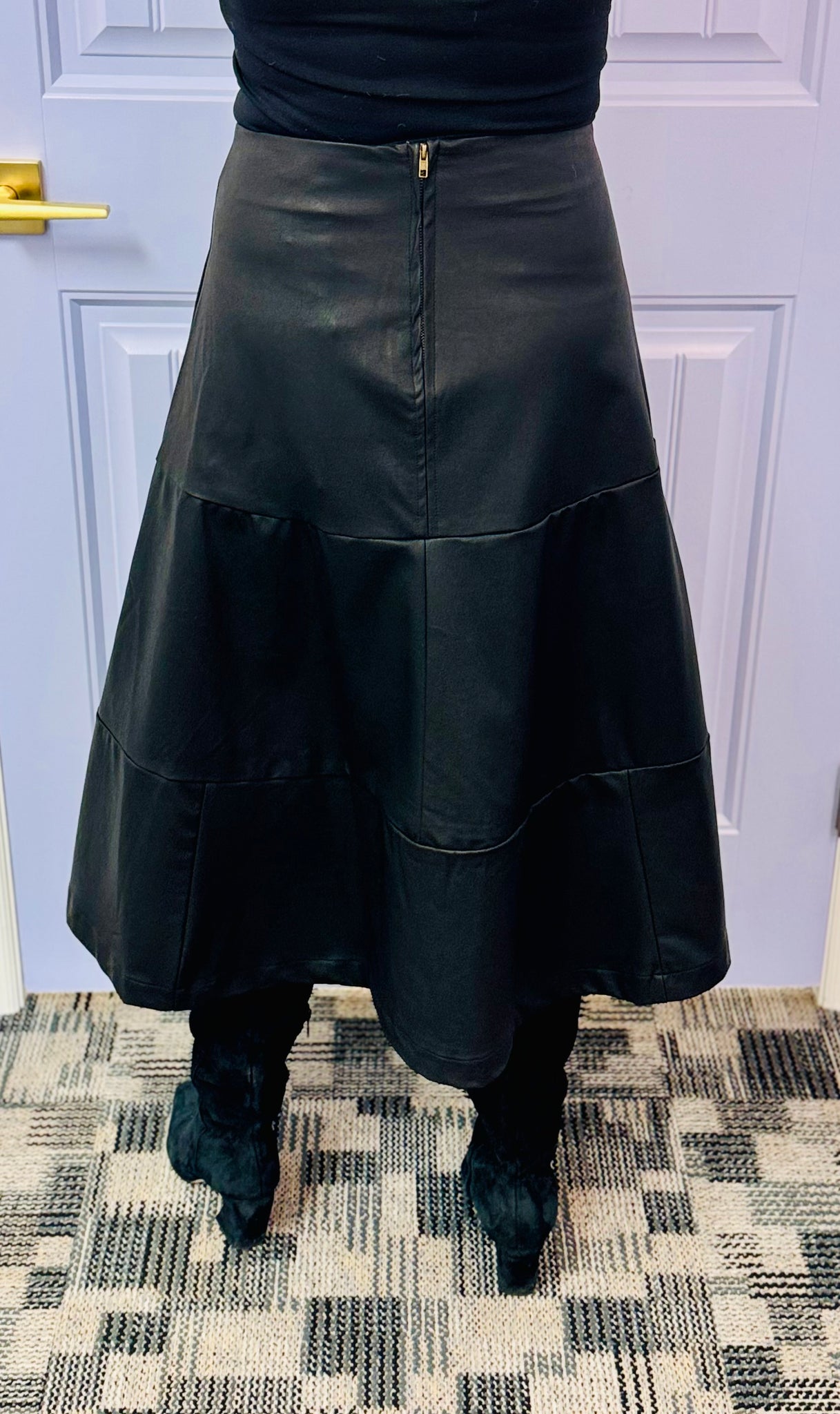 The Chesney is a faux leather A-lined, tiered midi skirt in the color black.
