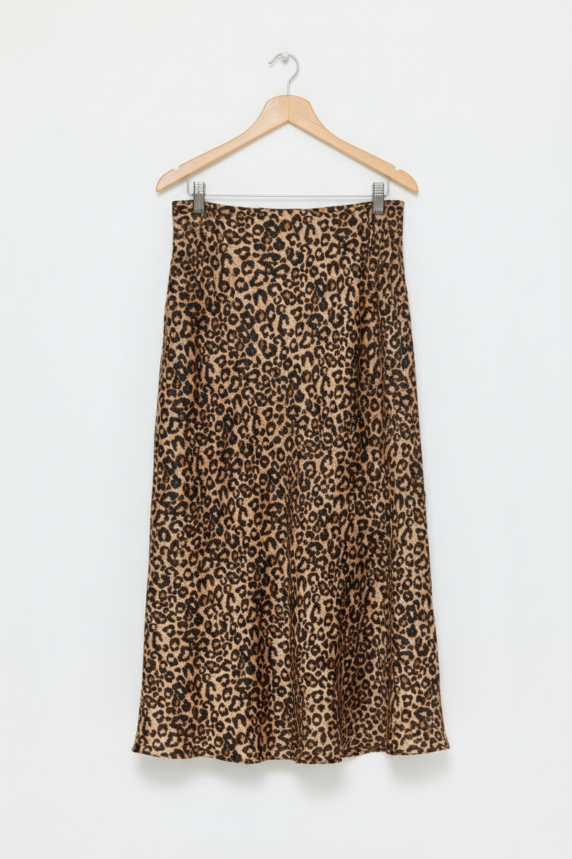 The Maddison is a Leopard printed midi skirt with a bias cut and drape. Elastized waist and invisible zipper.