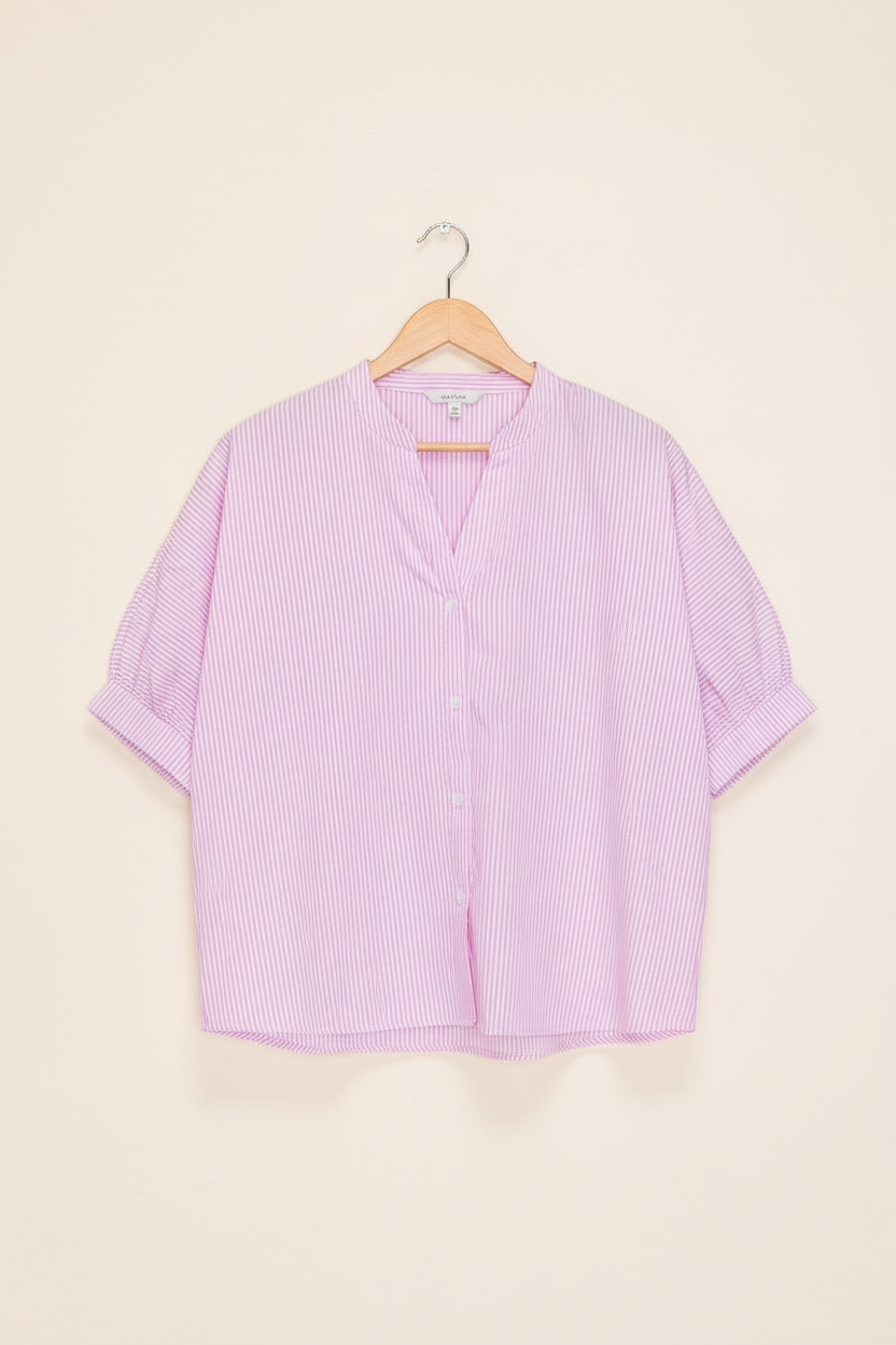 The Jenny is a china collar button down half sleeve pinstriped pink and white top.