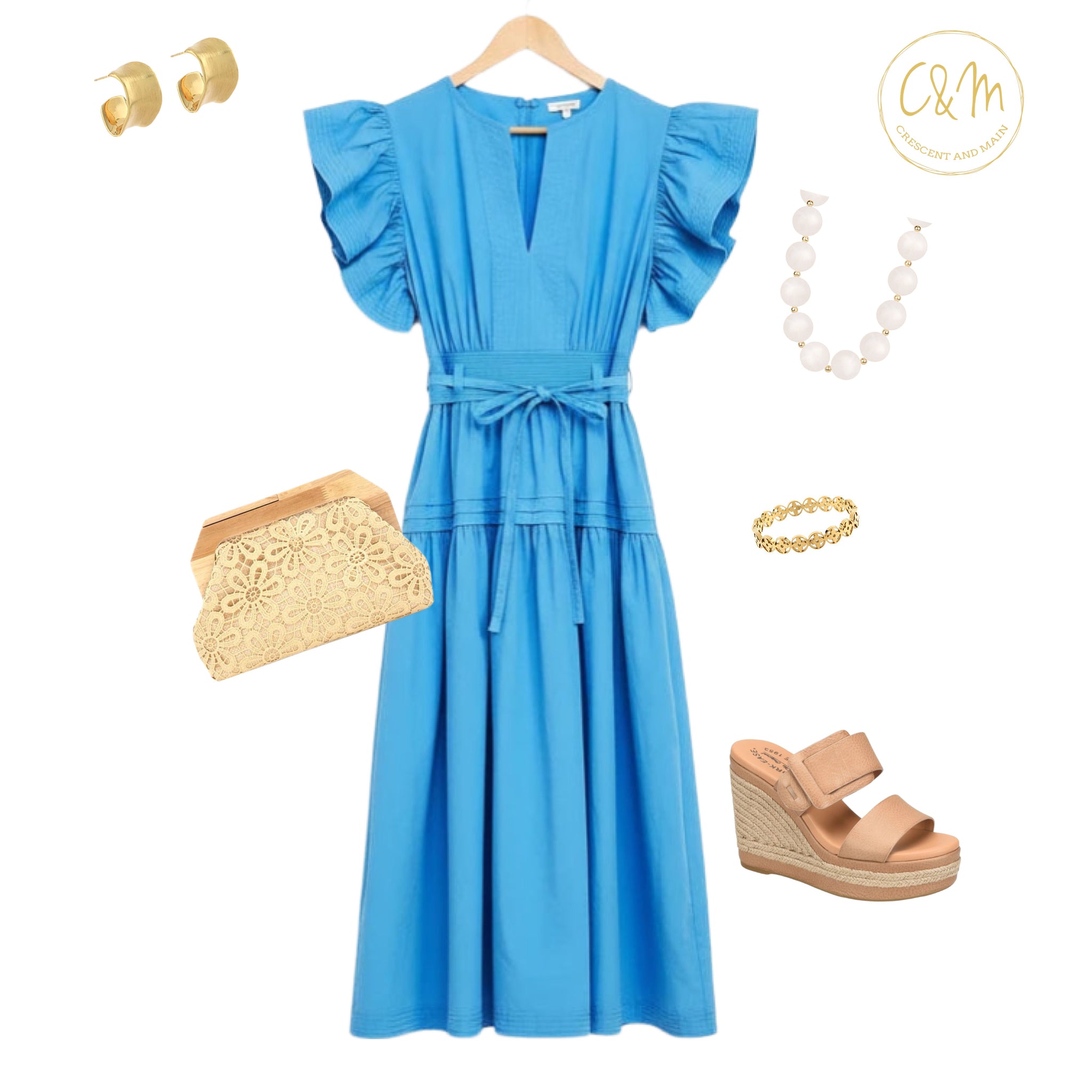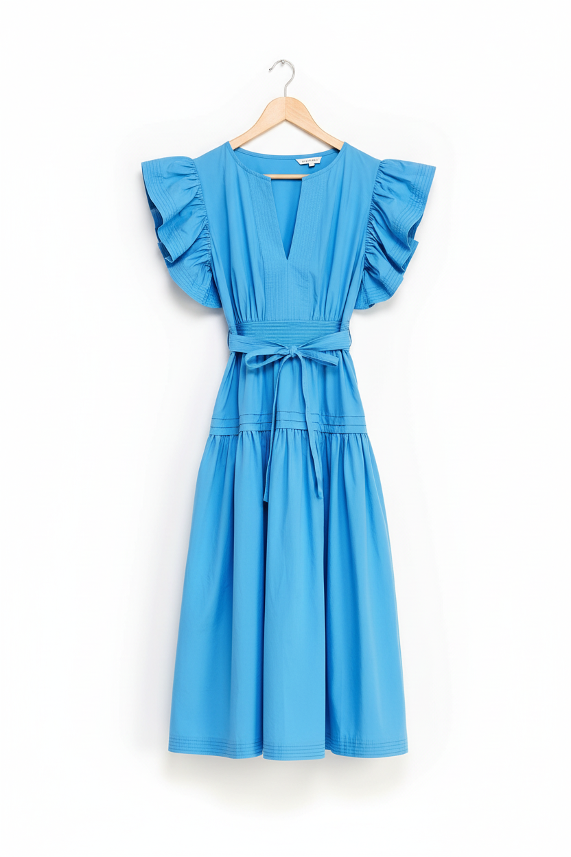The Nora is a flutter sleeve midi dress in cotton poplin fabric. This long dress features fluttered ruffle short sleeves with top stitch detail, a split V-neck, side pockets, midi skirt, side zipper closure, pintuck detail at shoulder/skirt, a removable waist tie, and cinched banded waist with stretch smock at back.