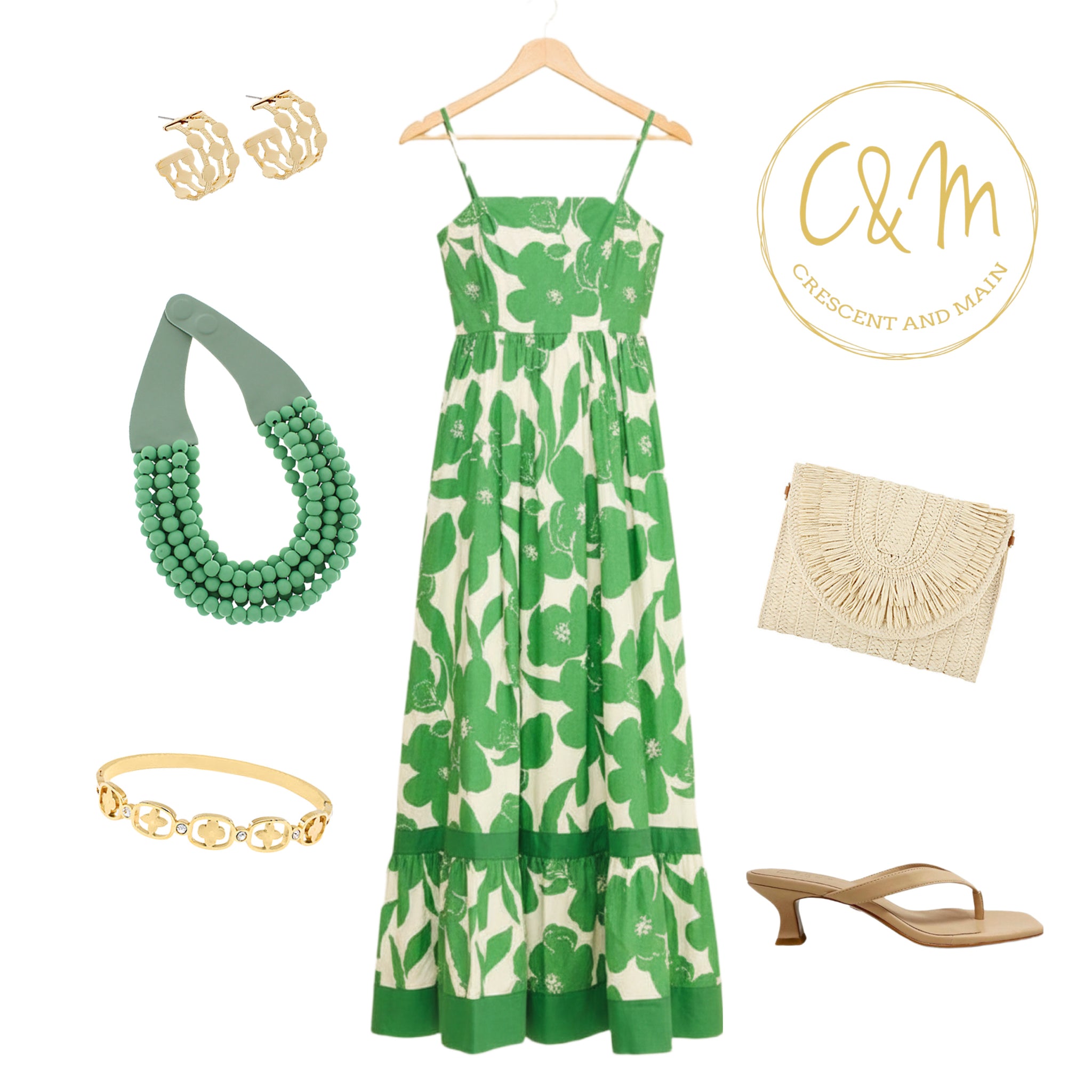 The Violette is a cotton floral maxi dress in green and white with spaghetti straps. Perfect for a summer day.
