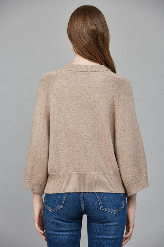 The Adrianna is a reglan 3/4” wide sleeve crew neck sweater in the color Mocha.
