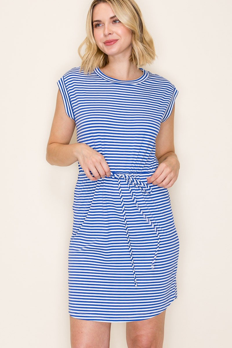 The Ashton is a navy and white striped jersey dress with a cap sleeve and drawstring waist.