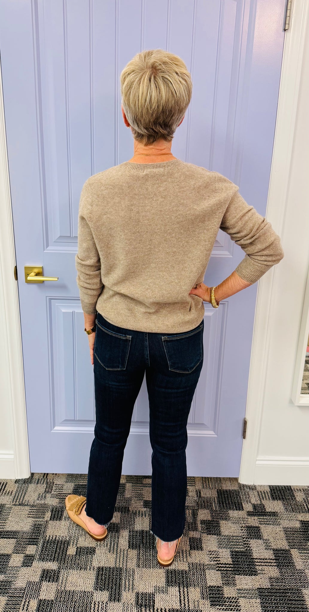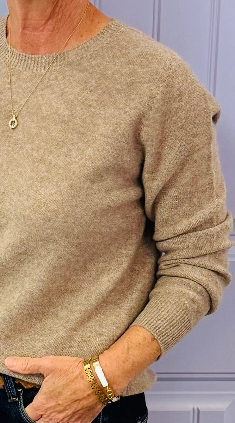 The Carter is a sparkled crew neck sweater in the color Mocha. Perfect for the holiday season.