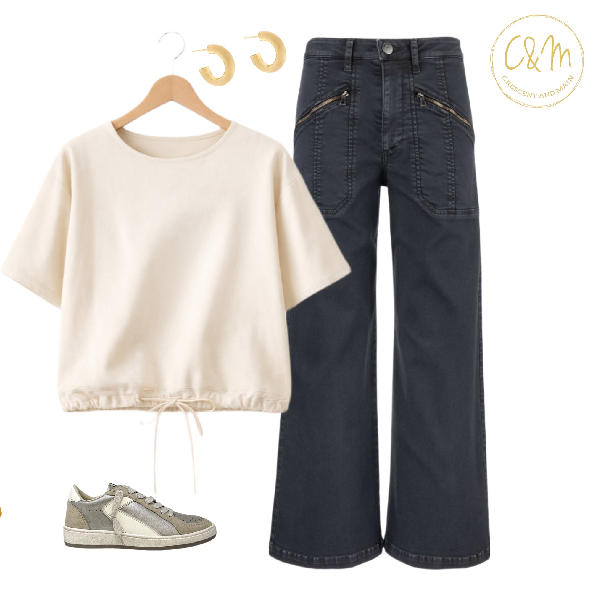 The Gemini is an ecru top with a tie bottom. Cotton blend