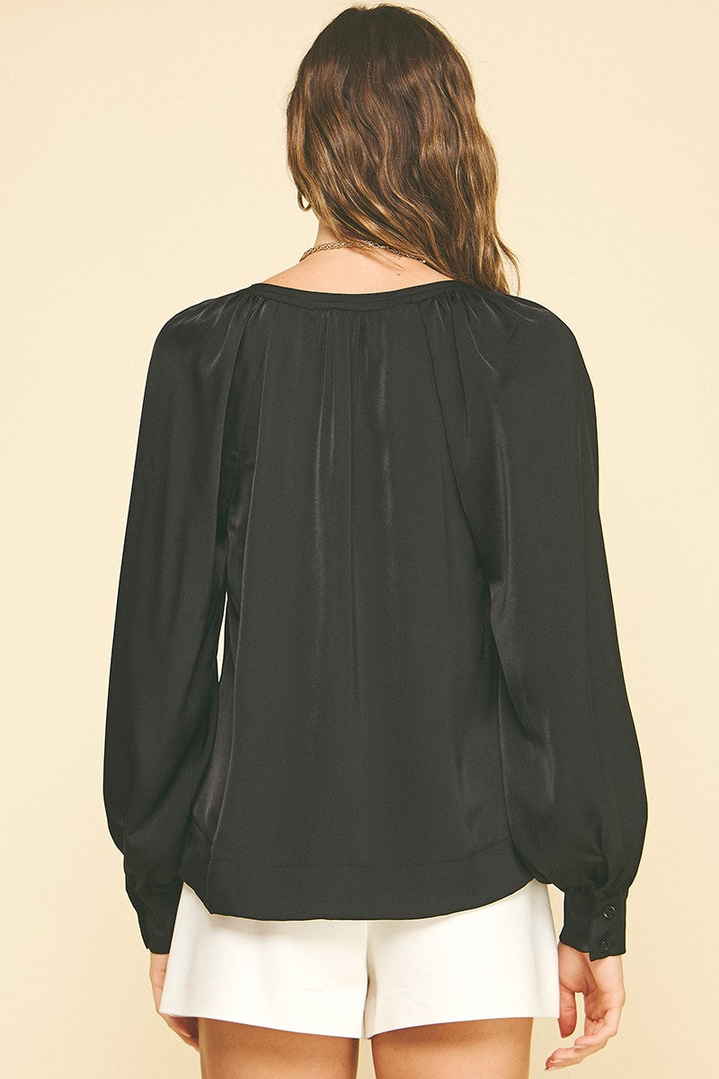 The Georgina is a V-neck, button sleeve blouse in the color Black.