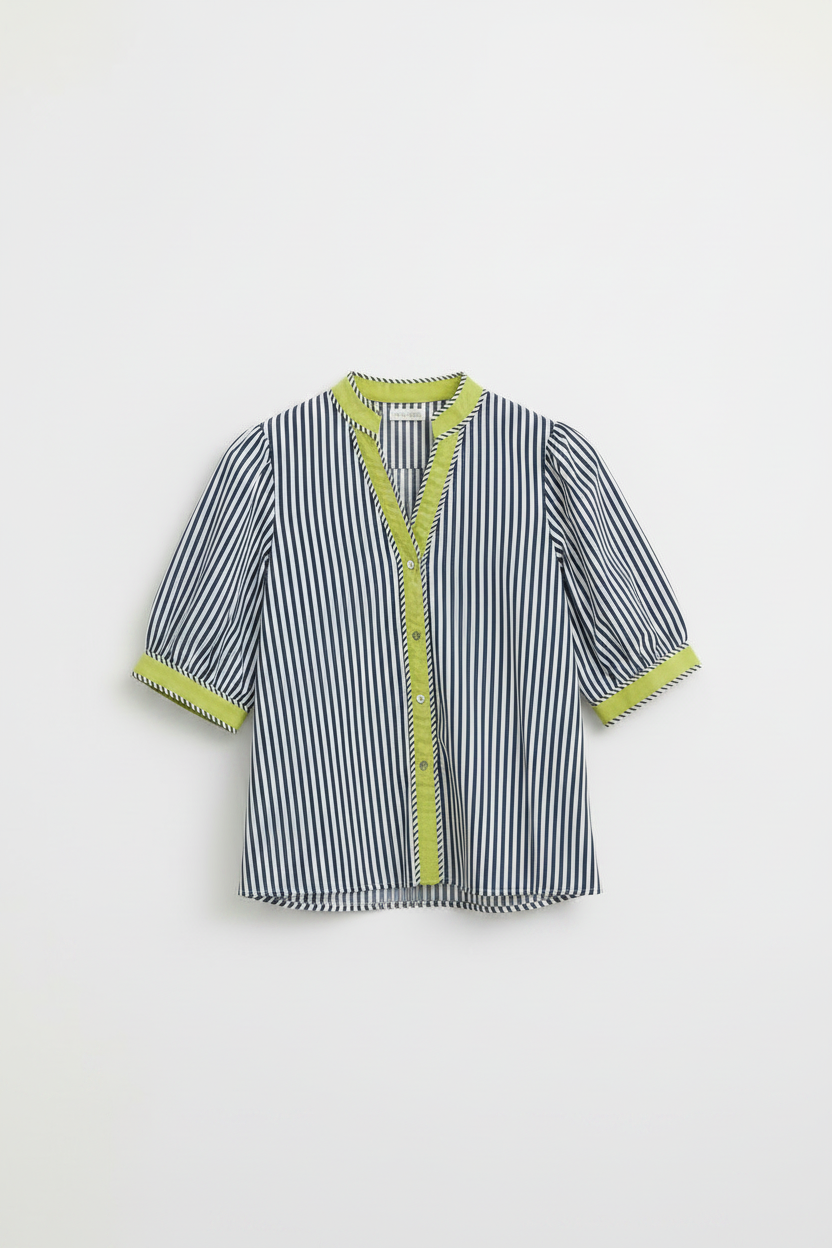 The Ginger is striped print short puff sleeve top featuring V-neckline with contrast binding. Button closure at front. Unlined. Woven. Non-sheer. Lightweight.