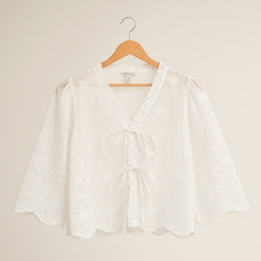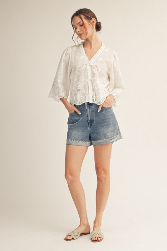 Embroidered  cotton top with ruffled v-neck and eyelet detail.