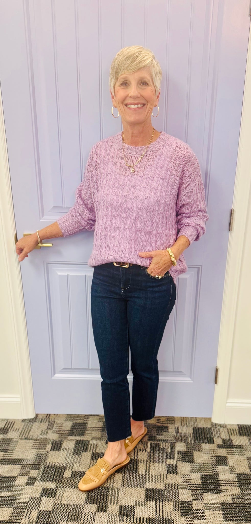 The Kara is a round neck super soft cable knit sweater in violet.