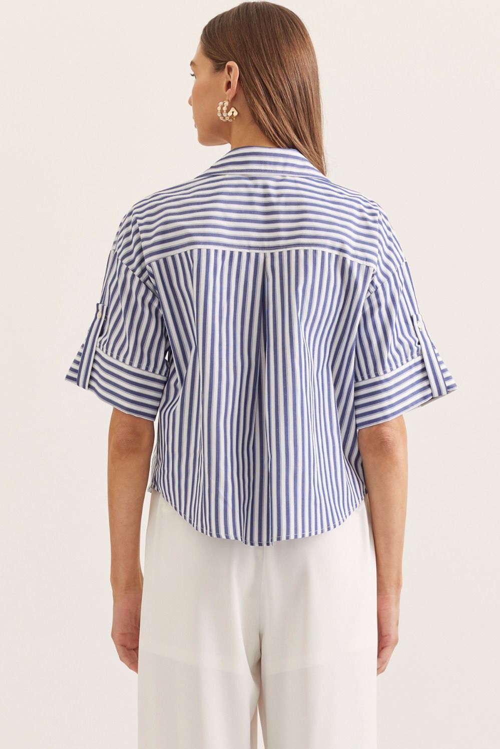 The Maggie is a striped elbow sleeve collared button-down top featuring contrast stripe placement at yoke and sleeves. Button closure at front. Unlined. Woven. Non-sheer. Lightweight. In the colors navy and white.