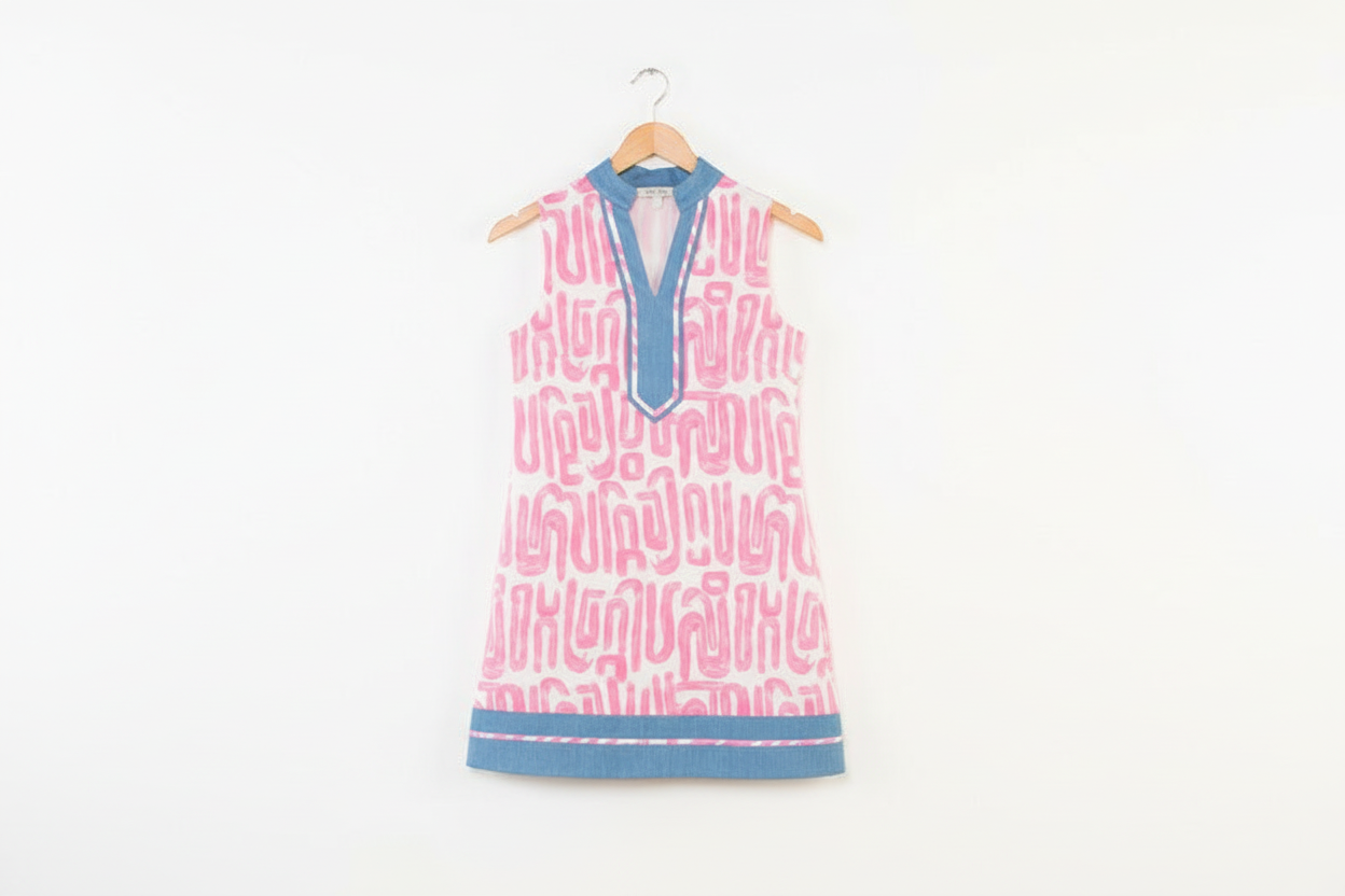 The Finley is a sleeveless abstract pattern dress in the color pink with a blue trim by THML.