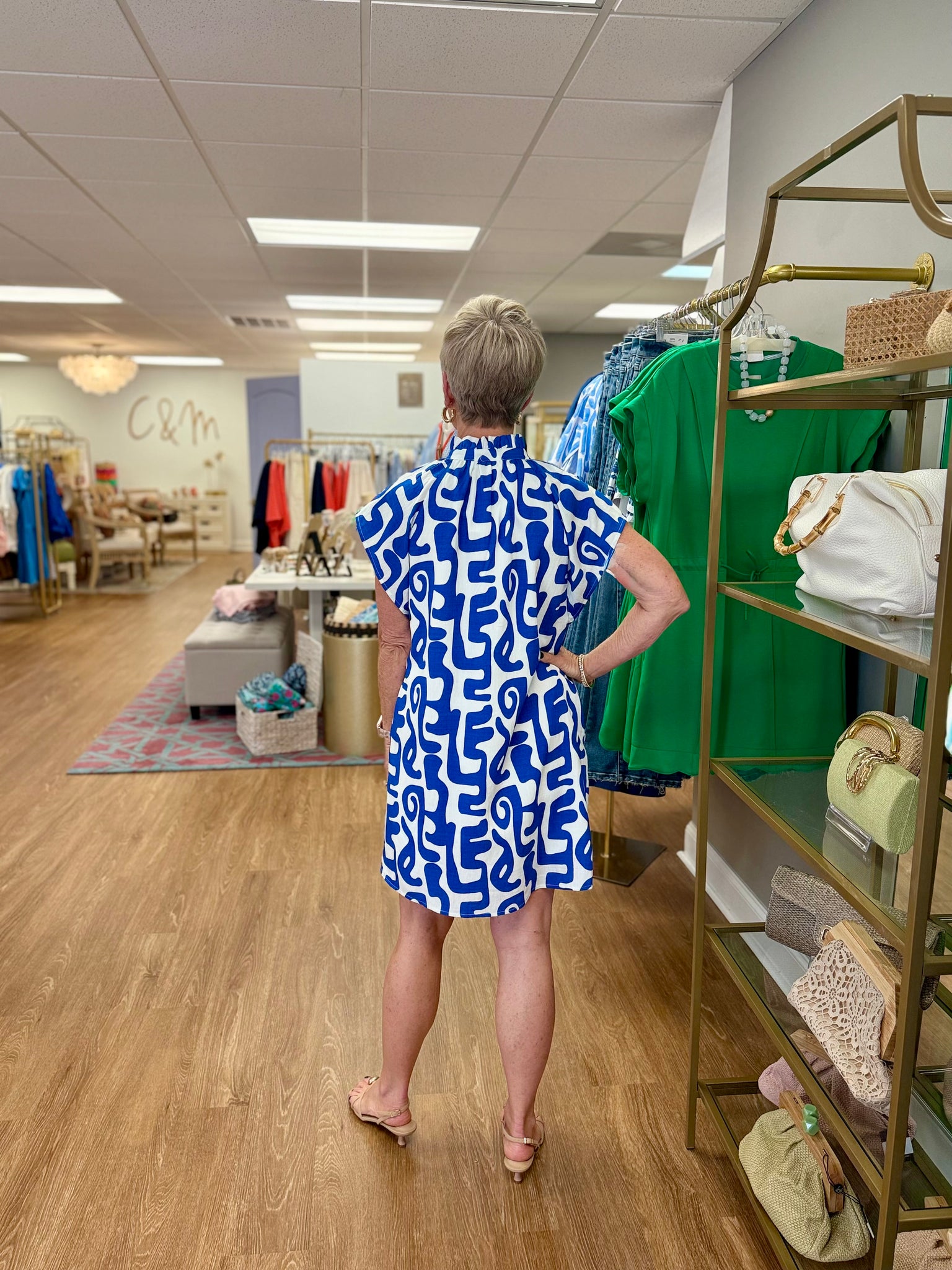 The Lulu is a bluegeometric print dress with a blue and white striped and pink accent down the front by THML.