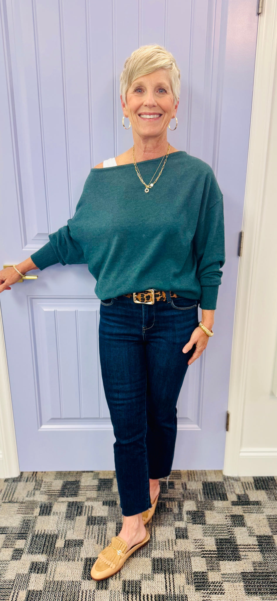 The Cory is a boat neck, long dolman sleeved sweater with ribbed knit bottom hem and cuffs in Emerald.
