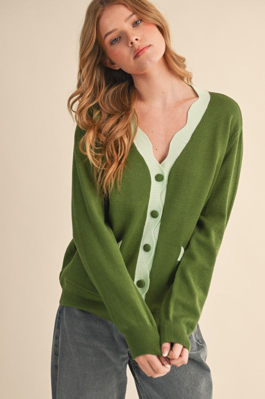 The Bianca is a scalloped sweater cardigan in Moss Blue.