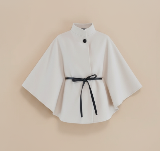 The Brandi is a cape coat with a stand up collar secured with a black button at the neckline. It has a flared silhouette and a black tie waist. In the color Beige.  One size fits most.
