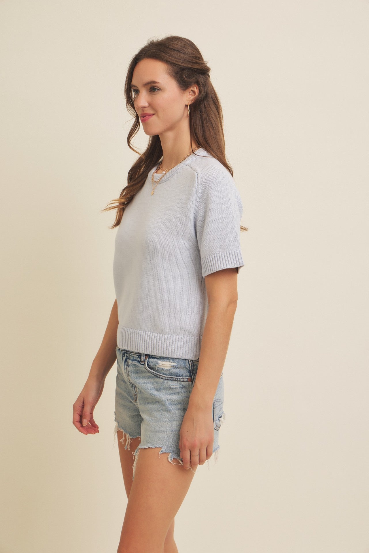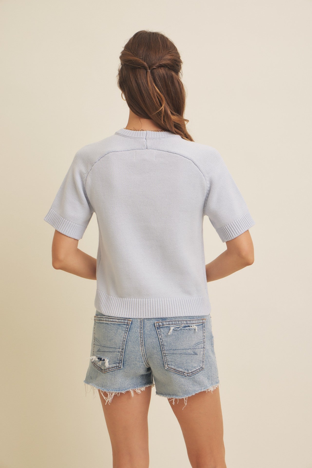 Cotton-blend sweater top with round neck, raglan short sleeves, and ribbed trim. Lightweight, versatile, and seasonless.