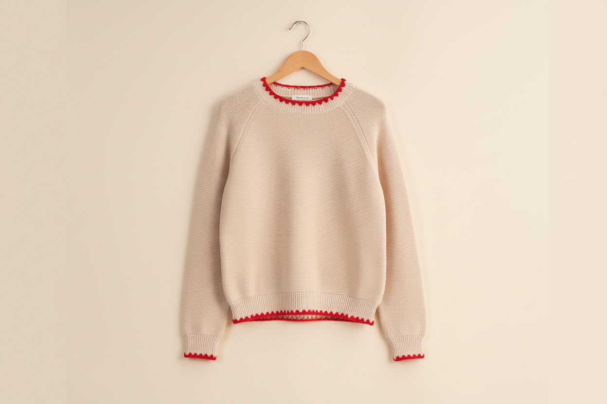 The Cece is a cotton contrast almond and red sweater with a rounded neckline with contrast hem.