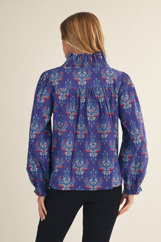 The Blu is a boho print long sleeved top with ruffled and smocked accents.