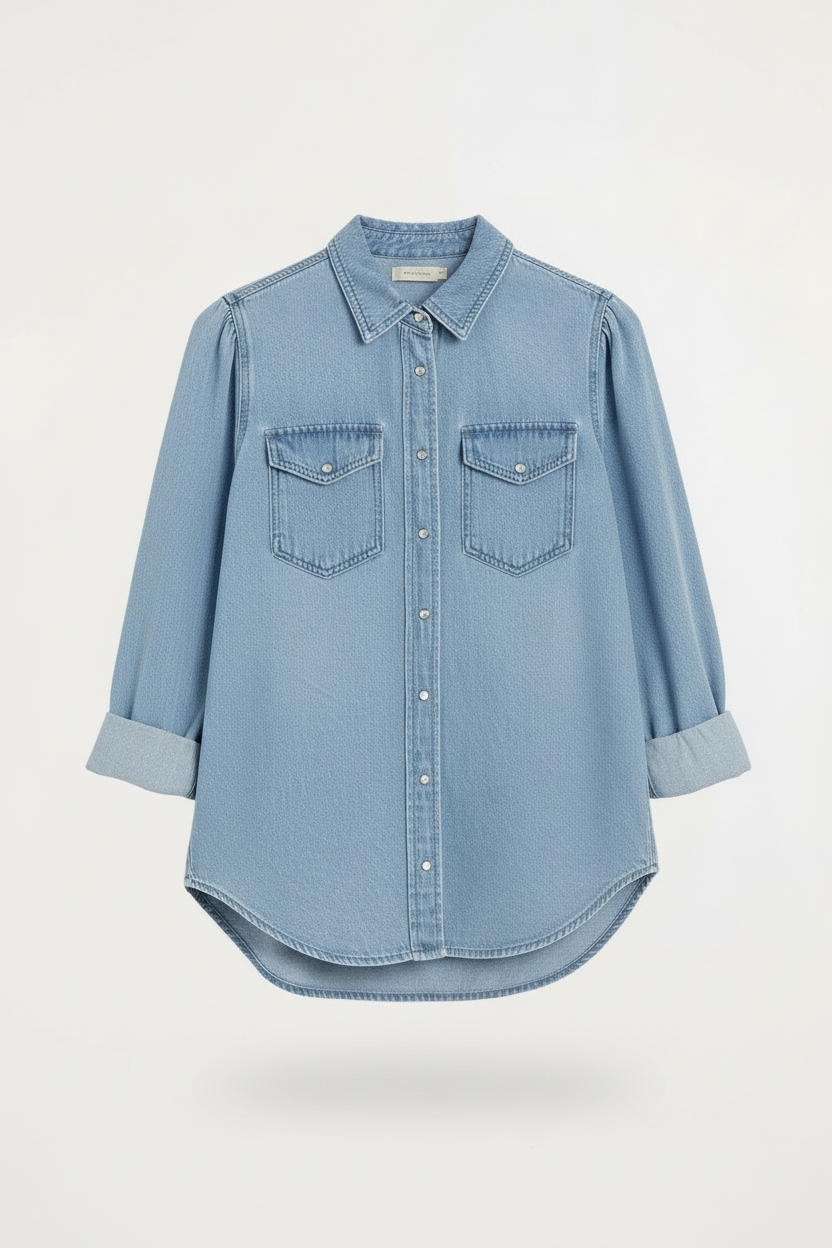 The Elise is a chambray relaxed fit button down top.