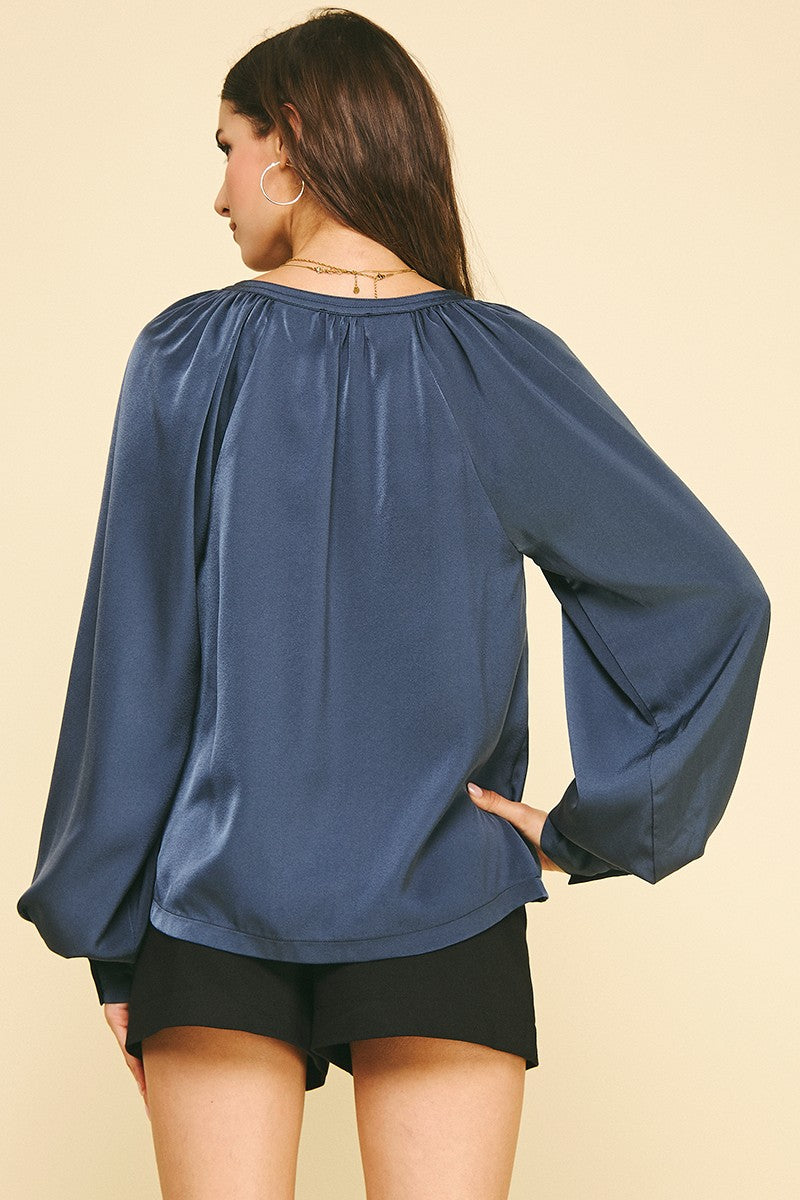 The Georgina is a V-neck, button sleeve blouse in the color Black.