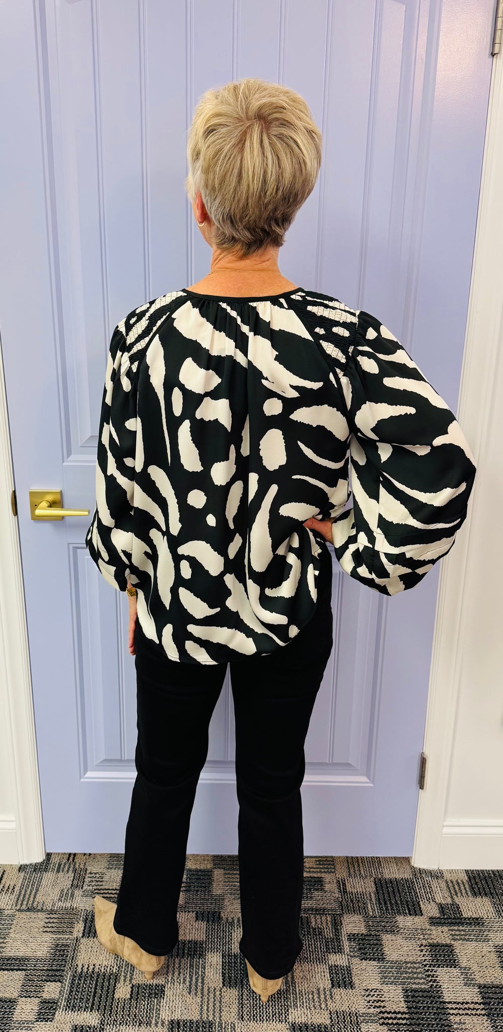 The Gloria is an abstract print, smocked shoulder detail blouse in black and white.