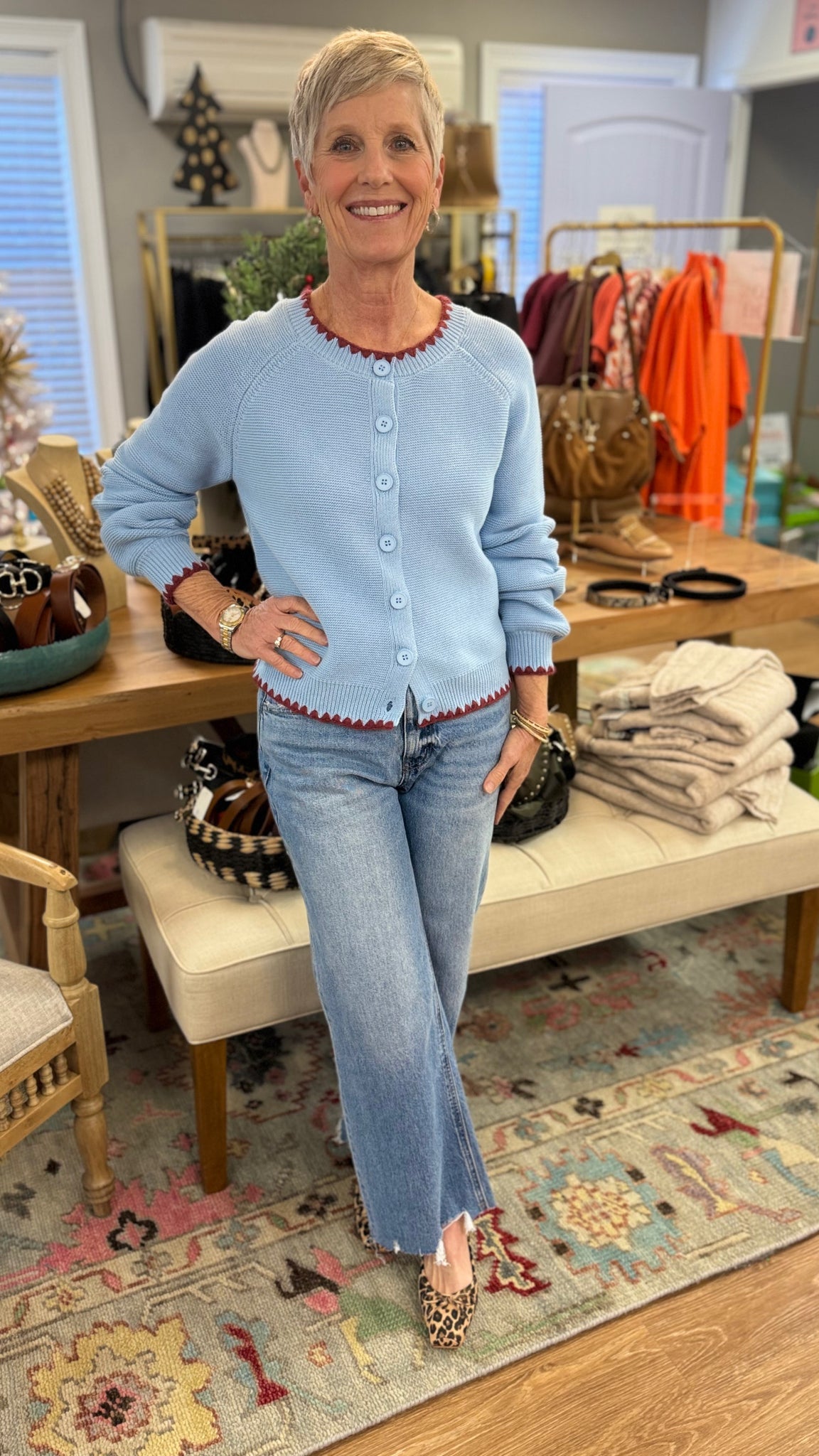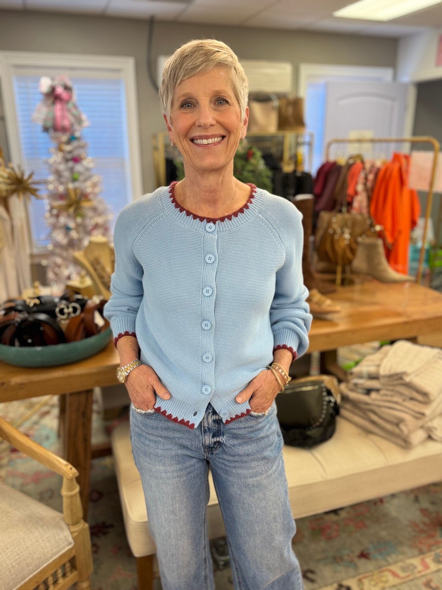 The Hendrix is a Blue cardigan with a red triangle stitch.