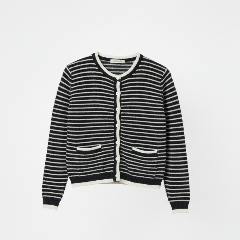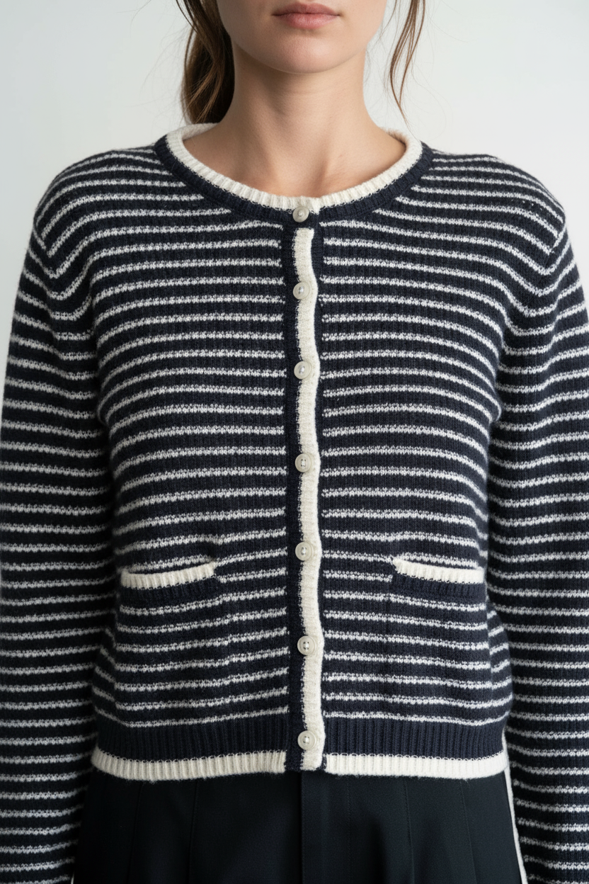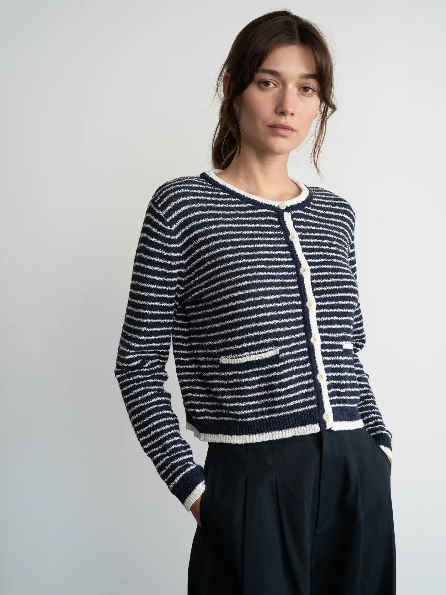 The Iggy is a navy and white striped cardigan with button front pockets.