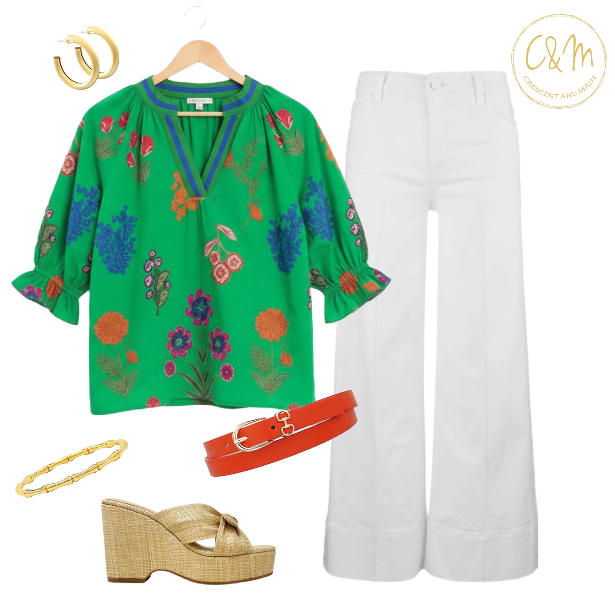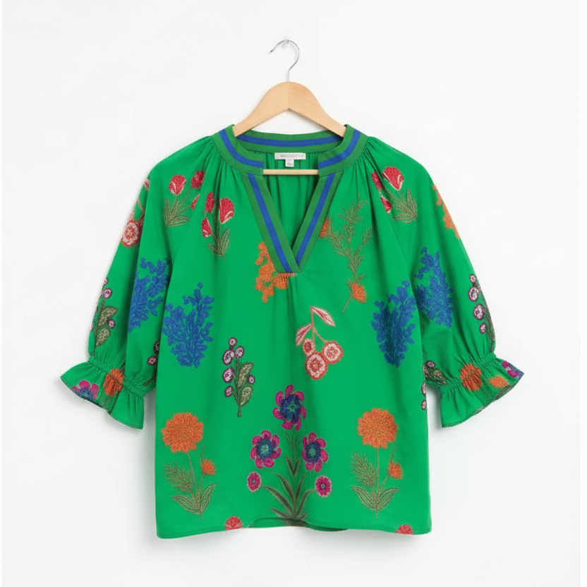 The Katelyn is a multi-floral print v-neck open collar top with contrast binding in Green.