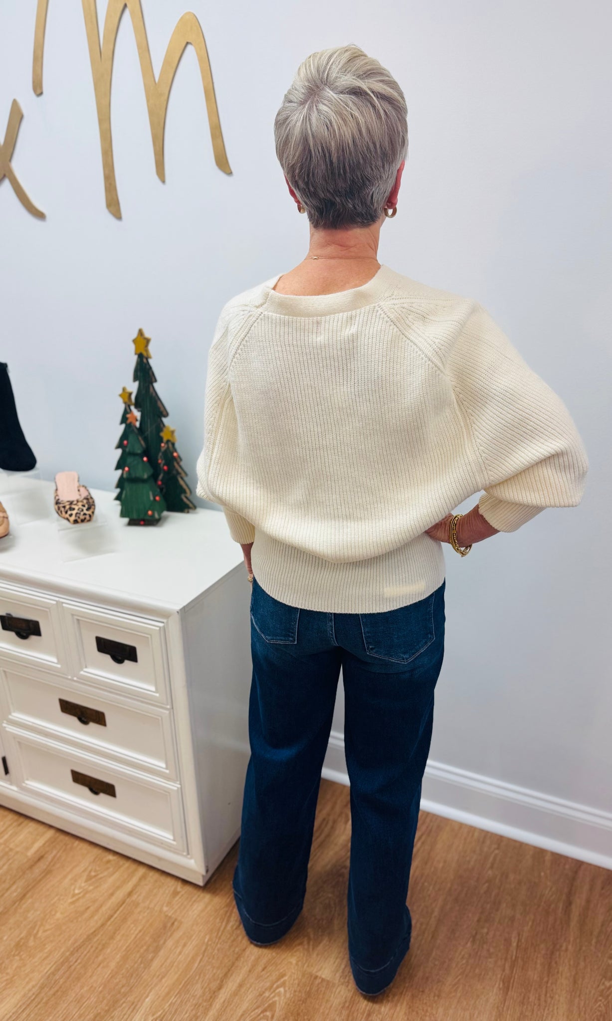 The Lia is a v-neck cardigan in the color Ivory. Perfect for layering. This cardigan is one size fits most. Fitting up to a size 10.