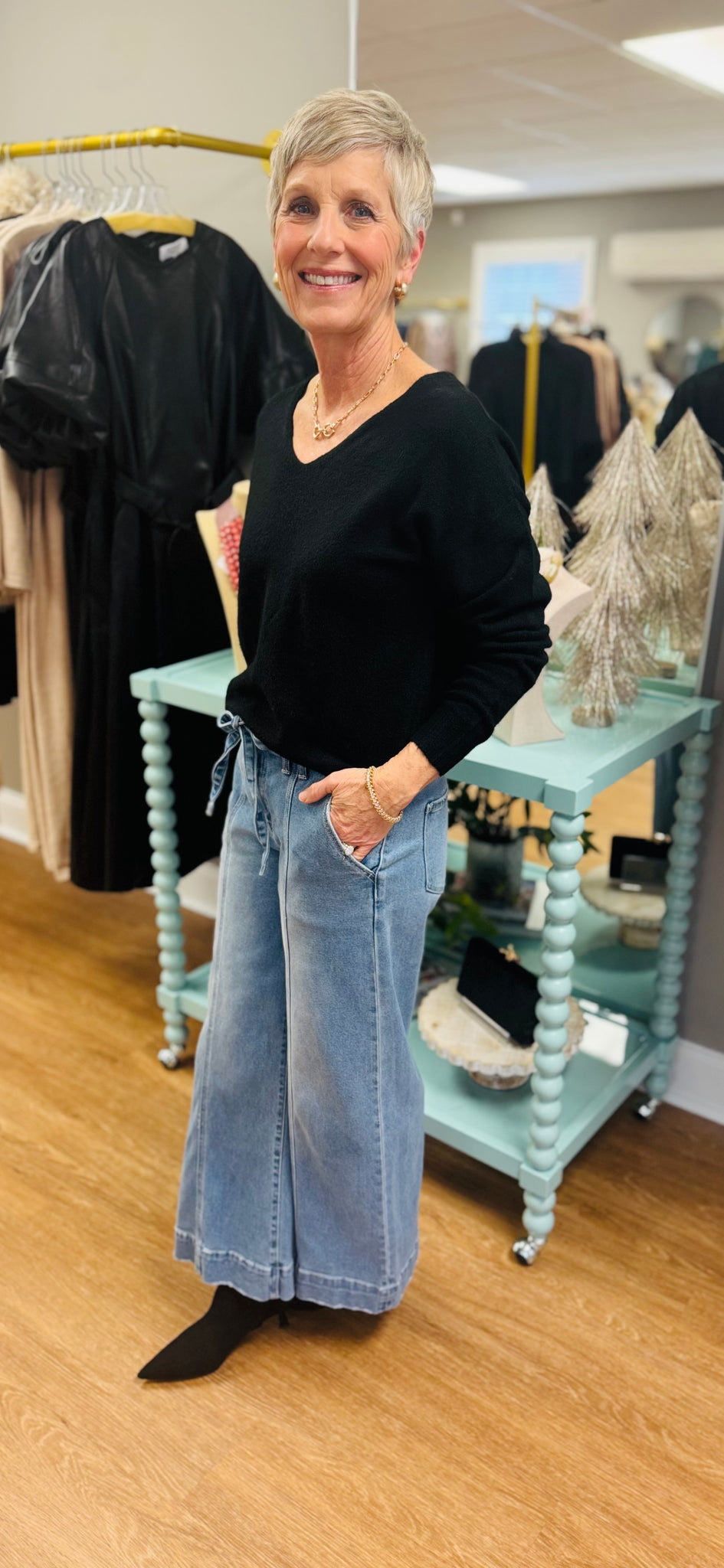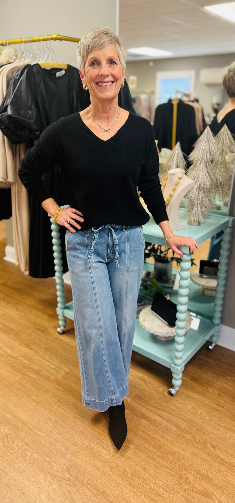 The Lina is a v-neck sweater in the color Black. Perfect staple for your winter wardrobe. This sweater is one size fits most and fits up to a size 12.