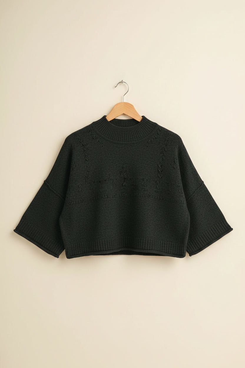 The Noli is a half sleeve, cropped at the waist sweater with a ribbed neckline and rolled edge detail in the color Ivory. Looks great alone but also makes a great layering piece.