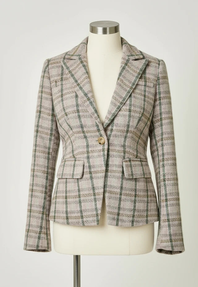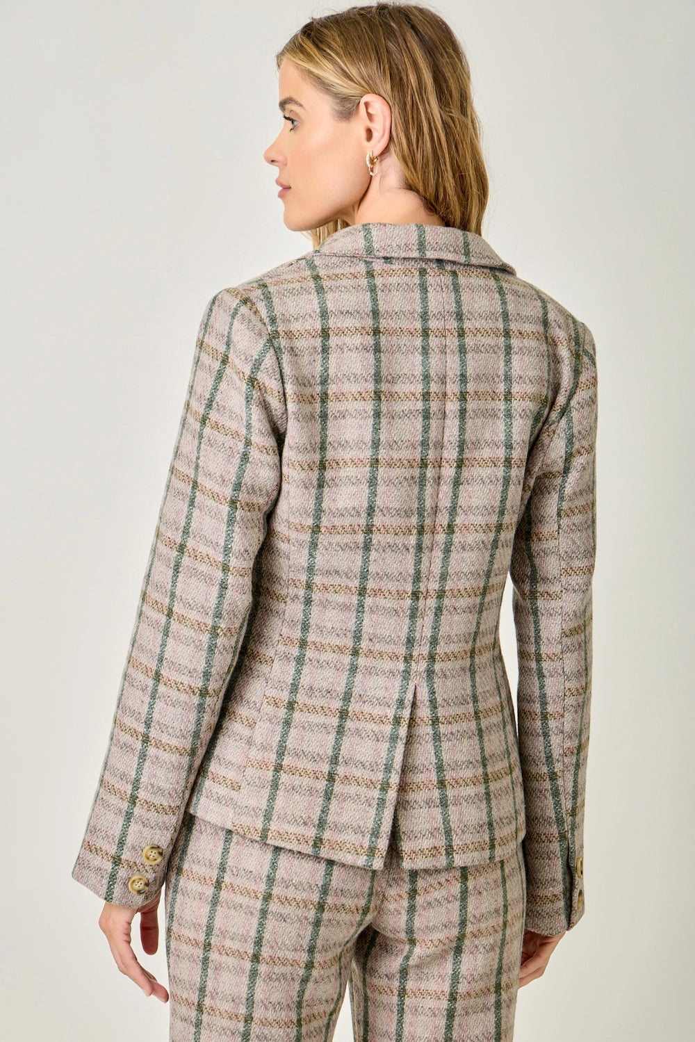 The Sunny is a single breasted plaid blazer in tans and greens.